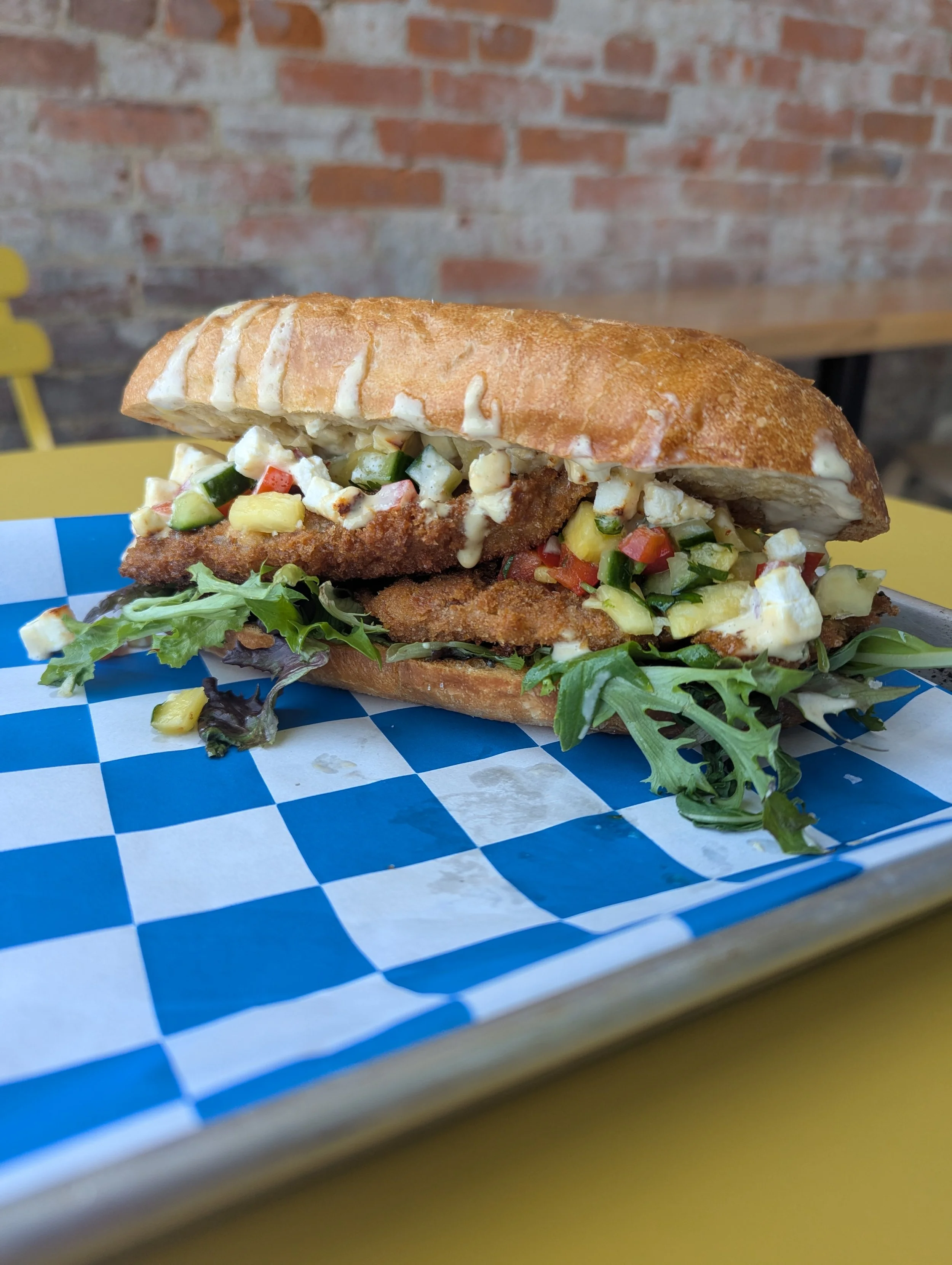 The fifth Friday in our Lenten special series! Breaded tilapia filets, pineapple/red pepper/cucumber/cilantro salsa, feta cheese, and greens on a toasted and buttered hoagie roll. Crunchy and savory with a sweet tropical salsa!