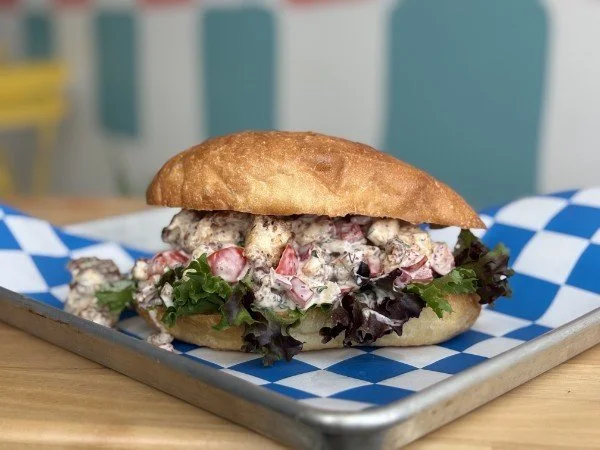 Chopped fried chicken, bacon, cherry tomatoes, bell pepper, red onion, and herbs lightly dressed in whole grain aioli. On a buttered toasted hoagie roll, with honey and greens.