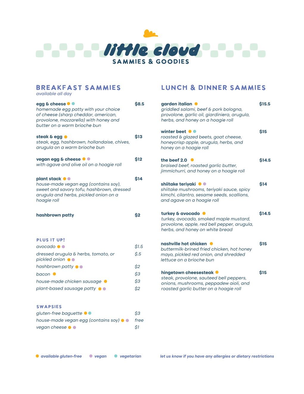 We proudly offer multiple gluten-free, vegan, and vegetarian options, so everyone can find something they’ll enjoy. We take allergies very seriously- if you have any restrictions, let us know!
